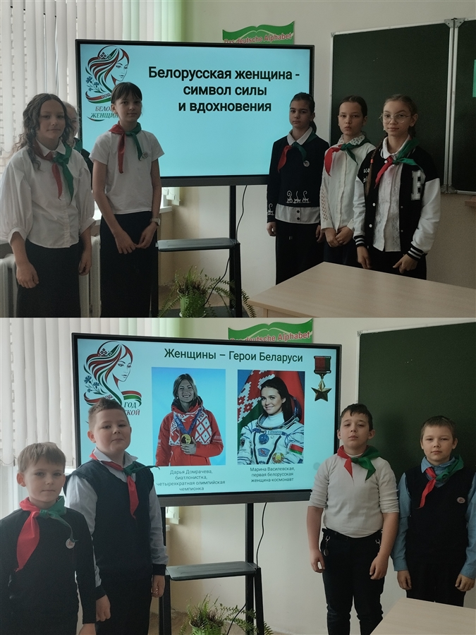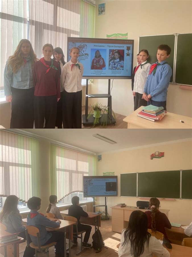 5 марта в учреждении образования прошел единый урок «Белорусская женщина – символ силы и вдохновения». Это занятие было приурочено к прекрасному весеннему празднику – Дню женщин, и стало данью уважения прекрасной половине человечества. В этот день учащиеся говорили не просто о празднике, а о глубокой и значимой роли, которую женщины играют в судьбе Беларуси. Главная цель урока – сформировать у каждого школьника уважение к женщине, помочь осознать ее огромный вклад в историю и современное развитие нашего государства. Ребята обсудили какие основные черты присущи белорусским женщинам: трудолюбие, забота, любовь. Ведь сегодня женщины – самая активная часть нашего общества. Они живут его интересами, не остаются в стороне от того, что происходит в родном крае, стране и мире, заявляют о себе значимыми делами и яркими проектами. Более того, многие успешно совмещают труд, материнство и общественную деятельность, добиваются высоких результатов в творчестве, профессиональной сфере. Главная женщина в жизни каждого человека -- мама. У каждого --- мама самая лучшая, самая красивая, самая заботливая и самая любимая. Учащиеся составили социальный портрет белорусской женщины, вспомнили женщин- белорусок, которые оставили неизгладимый след в истории нашей страны: Ефросинья Полоцкая, Туснолобова- Марченко, Вера Хоружая, Дарья Домрачева, Марина Василевская. На протяжении всей истории белорусские женщины играли ключевую роль в развитии общества.Современные белорусские женщины успешно сочетают заботу о семье, воспитание детей с работой и общественной деятельностью. Их вклад в различные сферы жизни обеспечивает прогресс белорусского общества.