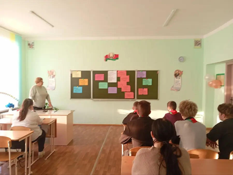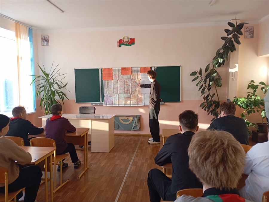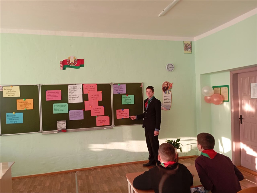 11 марта для учащихся 8-10 классов прошло тематическое занятие "Последствия Великой Отечественной войны для Беларуси". Ребята узнали страшную статистику о сожжённых и разрушенных заводах, фабриках, тысячах хозяйств, об исчезновении исторических и культурных ценностях. В переводе на стоимость мерных золотых слитков, это более 45 000 тонн, что в 35 раз превышало бюджет республики 1940 года.. И это только прямой материальный ущерб. Учащиеся вспомнили, о том, что самое болезненное и тяжёлое в войне - это гибель людей. Число жителей республики уменьшилось на треть. Такой ценой для нашей страны далась Великая Победа. А.Г. Лукашенко постоянно подчеркивает: "Победа -- это святое! И прикасаться к ней можно только чистыми руками и с чистой душой"