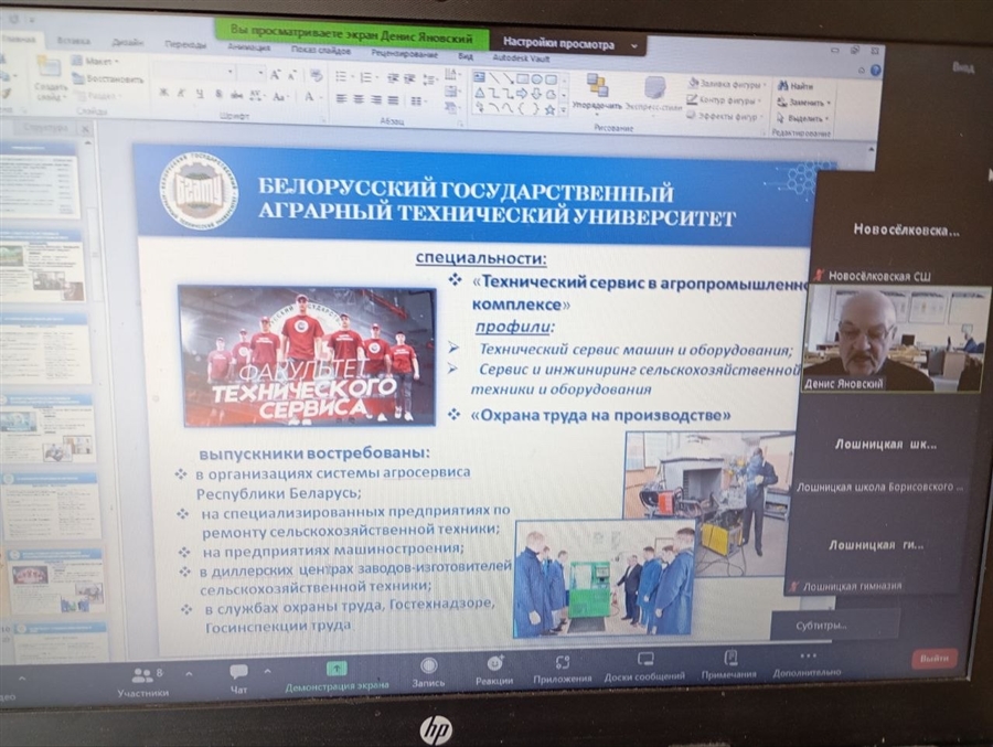 31 марта учащиеся аграрного класса Государственного учреждения образования "Новосёлковская средняя школа Борисовского района" участвовали в видеоконференции с представителями БГАТУ. Преподаватели ведущего аграрного высшего учебного заведения рассказали ребятам о своих факультетах и особенностях поступления 2026 года. Упор сделан на то, чтобы принимать в стенах ВУЗа талантливых и целеустремлённых школьников и надеяться, что многие из них найдут своё признание именно в аграрной сфере.