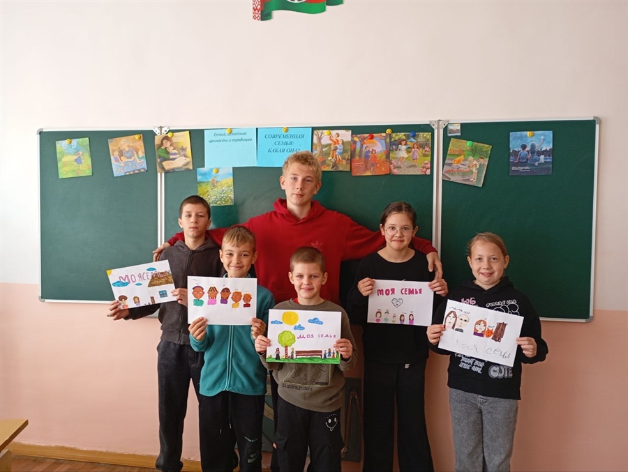 Про атмосферу в семье и важность семейных связей учащиеся начальных классов вспомнили в ходе мероприятия "Семья -- это лучшее место для жизни". Дети делились семейными историями, говорили о своих родных, которыми гордятся и чтут их память. Особое внимание было уделено родным- участникам Великой Отечественной войны, а также тем, кто долго трудился на земле в родном агрогородке. Учащаяся 4 класса Ходасевич Вероника подготовила гайд "Родственные связи", ведь разобраться в семейных узах так непросто. Ребята убедились, что семья и семейные ценности -- основа жизни нашего общества и страны. Мы вправе гордиться традиционными белорусскими семьями